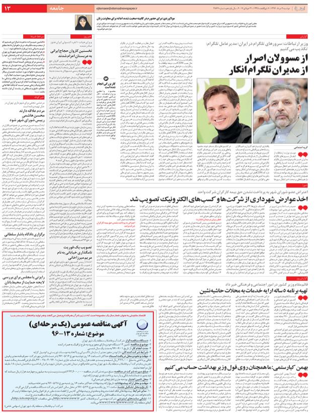 از مديران تلگرام انكاراخذ عوارض شهرداري از شركت‌ها و كسب‌هاي الكترونيك تصويب شدتهيه برنامه ۵ ساله ارايه خدمات به محلات حاشيه‌نشينبهمن كيارستمي: ما همچنان روي قول وزير بهداشت حساب مي‌كنيم
