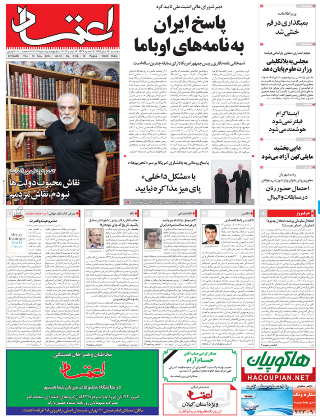 نقاش محبوب دولت‌ها  نبودم، نقاش مردممپاسخ  ايران  به نامه‌هاي  اوبامابا «مشكل داخلي»  پاي ميز مذاكره نياييدبمبگذاری در قم  خنثی شدمجلس به بلاتكليفي  وزارت علوم پايان دهداينستاگرام  فيلتر نمي‌شود  هوشمند مي‌شوددايي بخشيد  مايلي‌كهن آزاد مي‌شود احتمال حضور زنان درمسابقات واليبالانحلال سازمان برنامه، انحلال چه بود؟ احياي آن، احياي چيست؟ تاكيد بر روابط اقتصاديگام موفق دولت تدبير واميد  در عرصه سلامت مردم ايرانجناب آقاي دكتر يزدي! با خودتان صادق باشيد، تاريخ كه جاي خود دارد!مشروعيت و قدرت